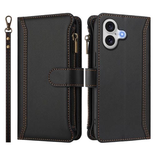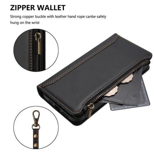 Funda de cuero con cierre magnético para iPhone 17, 9 ranuras para tarjetas, cremallera y correa de mano (negra)