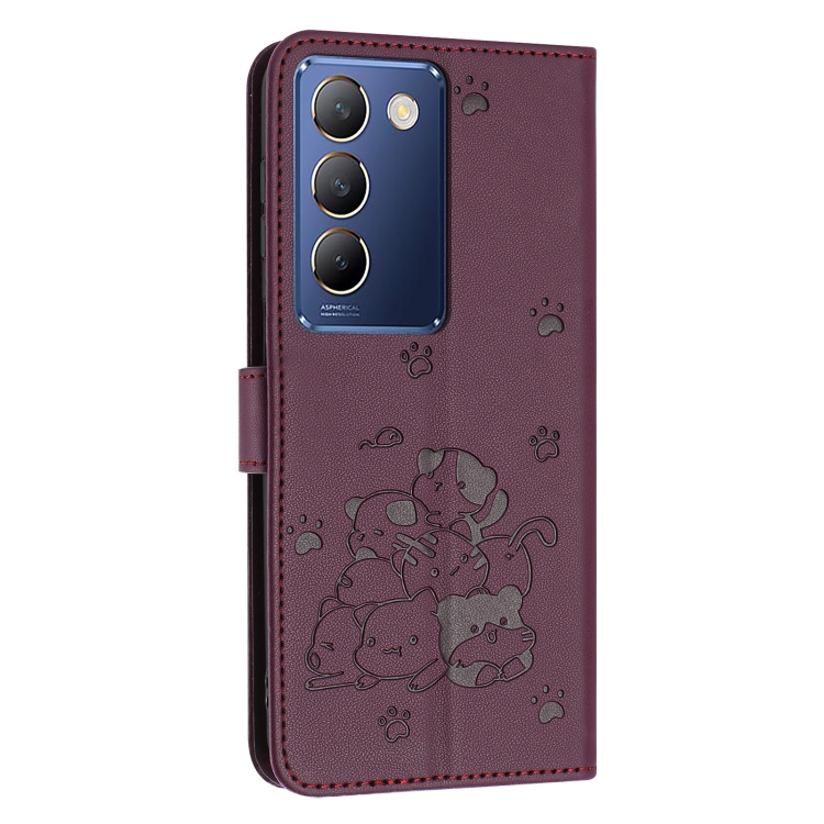 Funda de Piel con Estampado de Gatito y Cordón para Vivo Y100 Idn / Y200E 5G (Rojo Vino)
