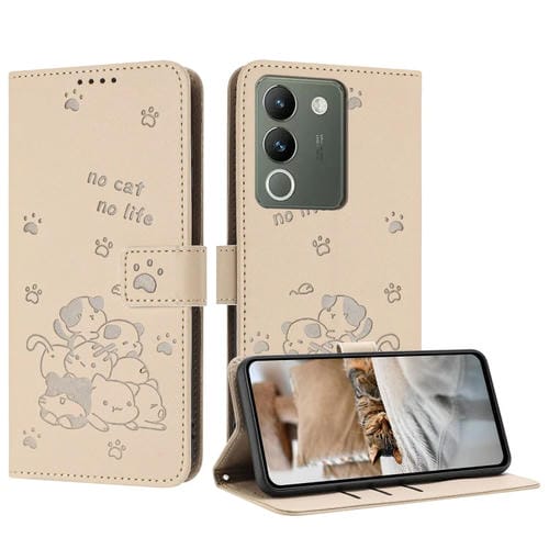 Funda de Cuero con Estampado de Gatito En Relieve para Vivo Y200 5G (Beige)
