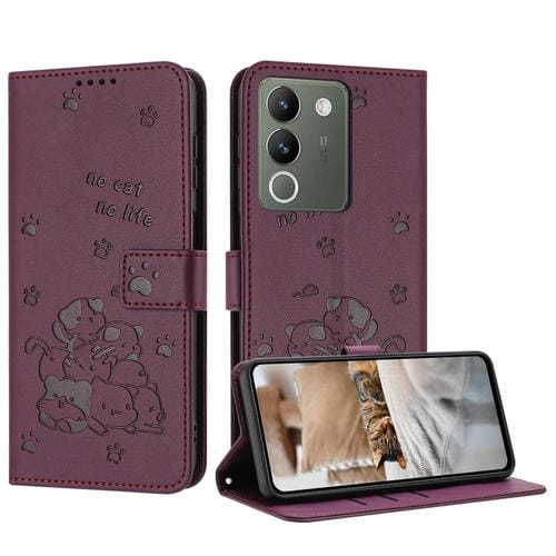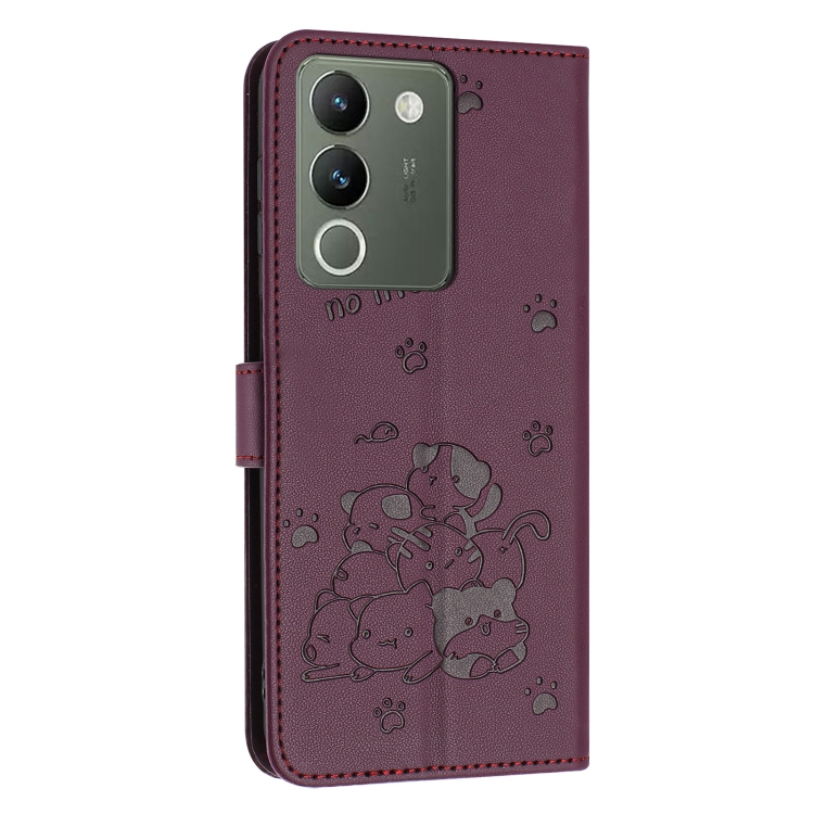 Funda de Cuero con Estampado de Gatito En Relieve para Vivo Y200 5G (Rojo Vino)