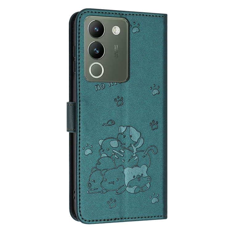 Funda de Cuero con Estampado de Gatito y Cordón para Vivo Y200 5G (Verde Oscuro)