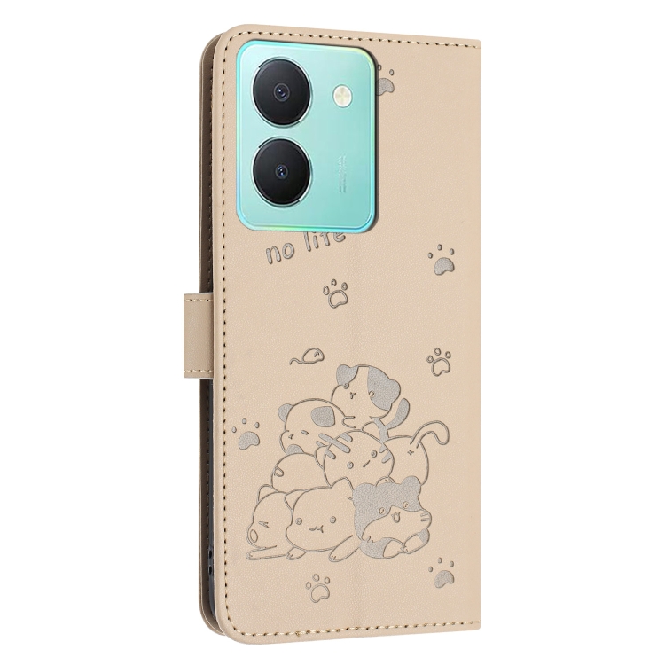 Funda de Cuero con Estampado de Gatito y Cordón para Vivo Y36 4G/5G (Beige)