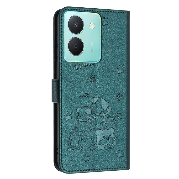Funda de Piel con Diseño de Gatito En Relieve para Vivo Y36 4G/5G (Verde Oscuro)