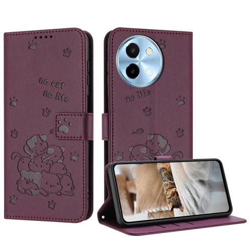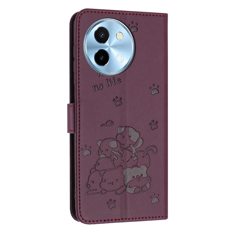 Funda de Piel con Estampado de Gatito y Cordón para Vivo Y38 5G (Rojo Vino)