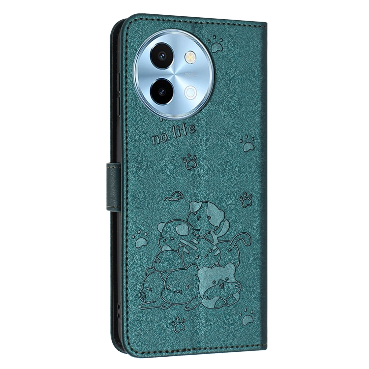 Funda de Cuero con Estampado de Gatito y Cordón para Vivo Y38 5G (Verde Oscuro)