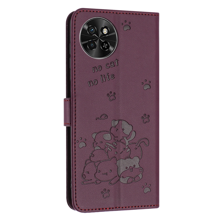 Funda de Cuero con Cordón para Teléfono Itel S23 con Gatito en Relieve (Rojo Vino)