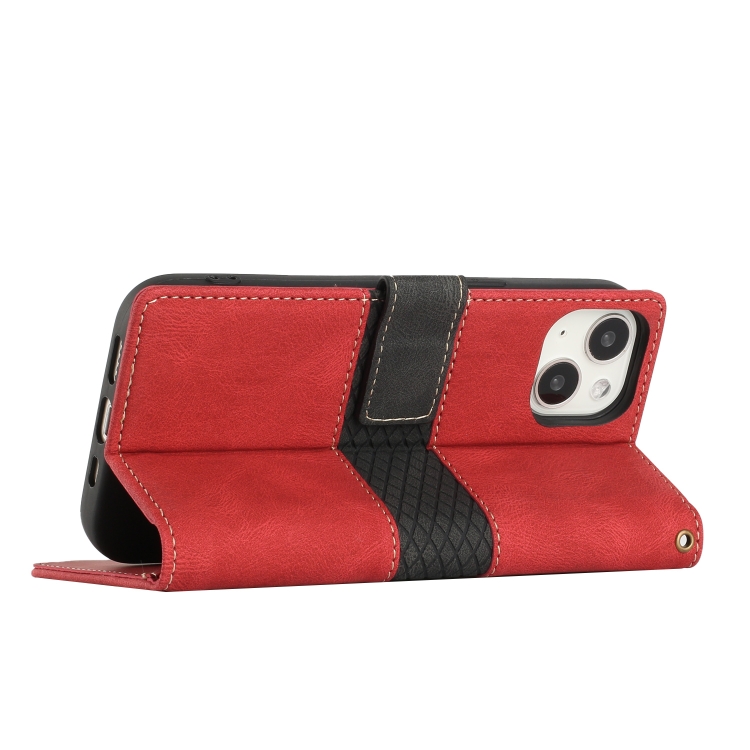 Funda de Cuero para iPhone 13 con Costuras de Cuadrícula y Cordón (Rojo)