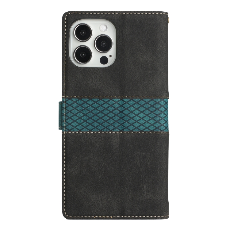 Funda de Cuero iPhone 15 Plus Costuras de Cuadrícula con Cordón (Negro)