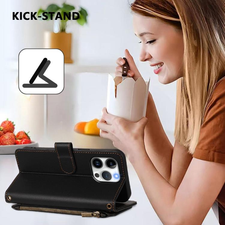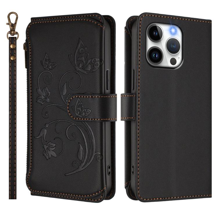 Funda de cuero con cremallera para iPhone 13 Pro Max, diseño de mariposas, flores y amor, con múltiples tarjetas (negro)