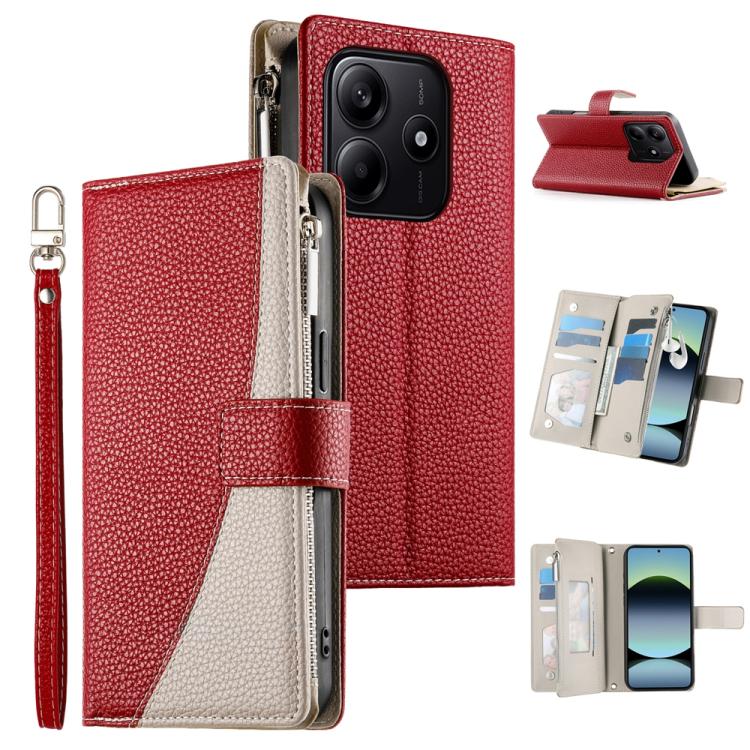 Funda de cuero con cremallera para Redmi Note 14 5G, con costuras globales, múltiples tarjetas y correa corta (roja)