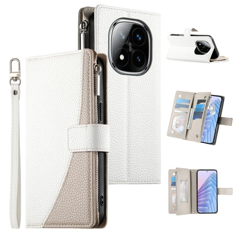 Funda de cuero con cremallera para Redmi Note 14 Pro 4G, con costuras, para múltiples tarjetas y correa corta (blanca)