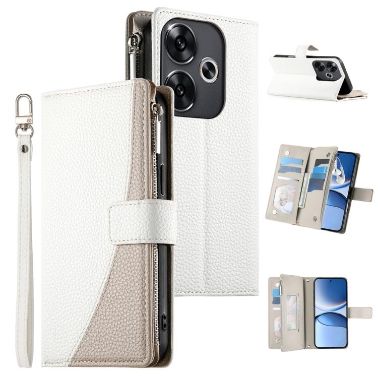Funda de cuero con cremallera para Redmi Turbo 3 y Xiaomi Poco F6, con costuras, para múltiples tarjetas y correa corta (blanca)