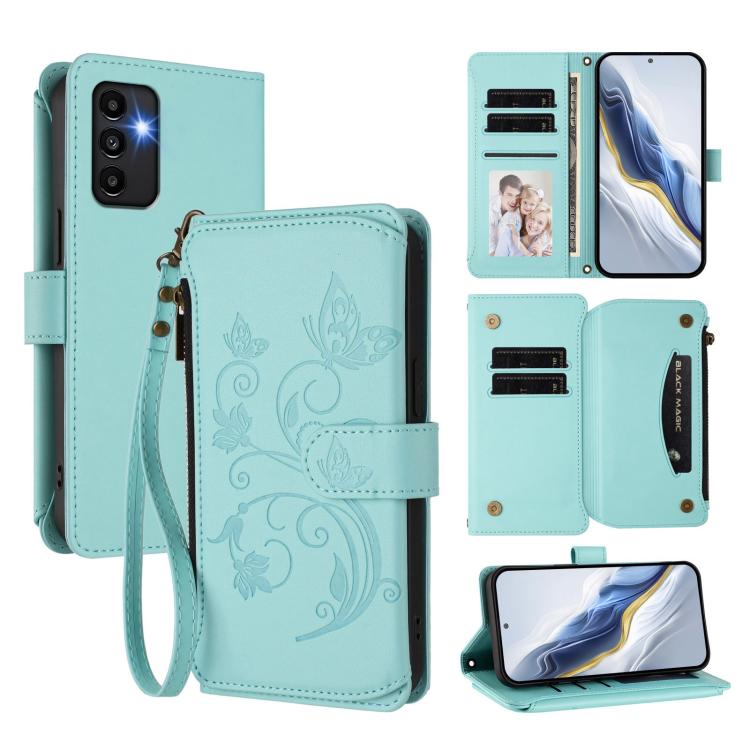 Funda de cuero con cremallera para Samsung Galaxy A13 4G / 5G / A04 4G, diseño de mariposas y flores, con múltiples tarjetas (verde menta)