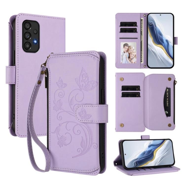 Funda de cuero con cremallera para Samsung Galaxy A33 5G, diseño de mariposas, flores y amor, con múltiples tarjetas (morado claro)