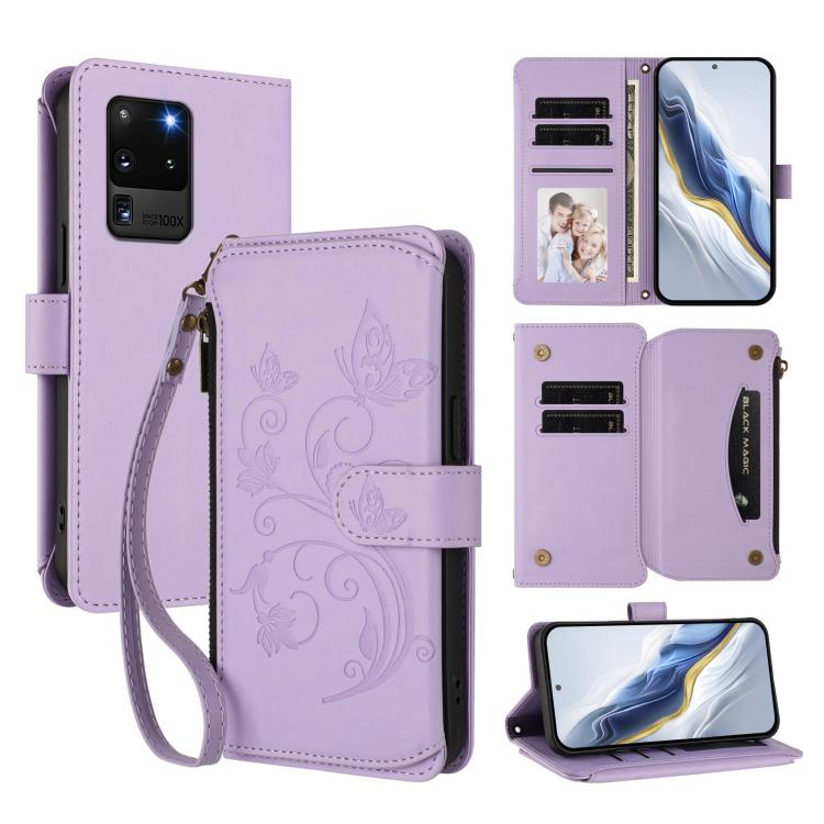 Funda de cuero con cremallera para Samsung Galaxy S20 Ultra, diseño de mariposas, flores y amor, con múltiples tarjetas (morado claro)