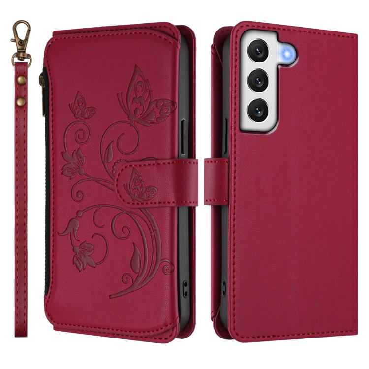 Funda de cuero con cremallera para Samsung Galaxy S21+ 5G, diseño de mariposas, flores y amor, con múltiples tarjetas (rojo vino)