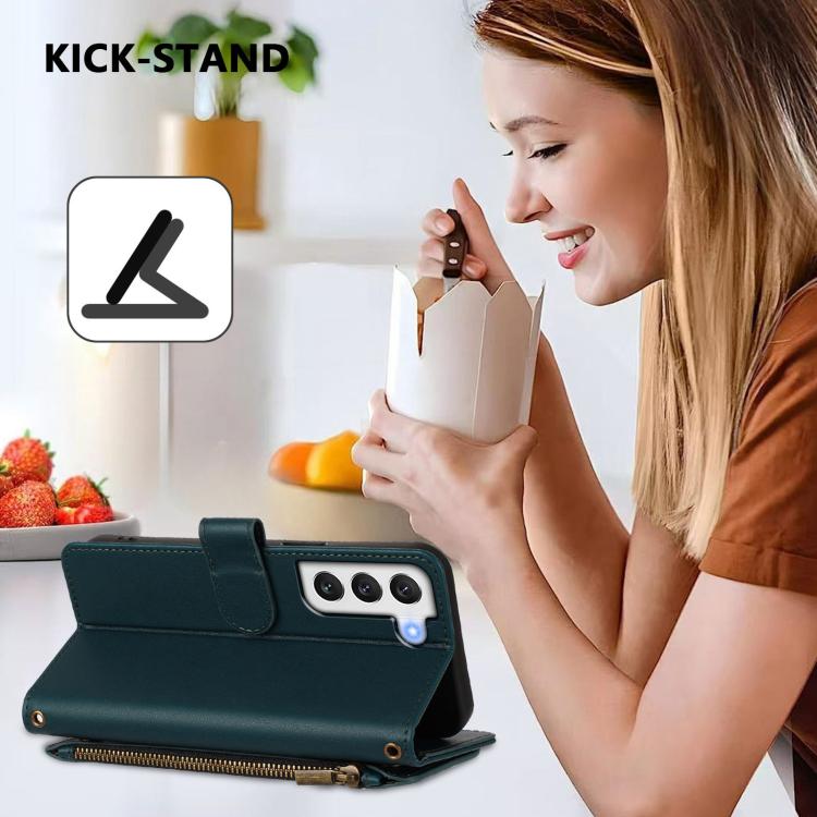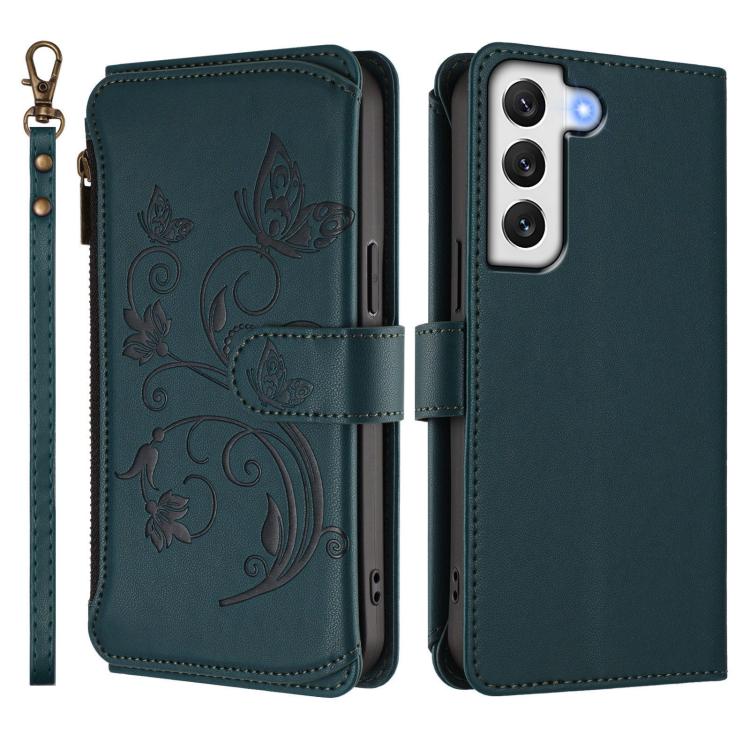 Funda de cuero con cremallera para Samsung Galaxy S22 5G, diseño de mariposas, flores y amor, con múltiples tarjetas (verde oscuro)