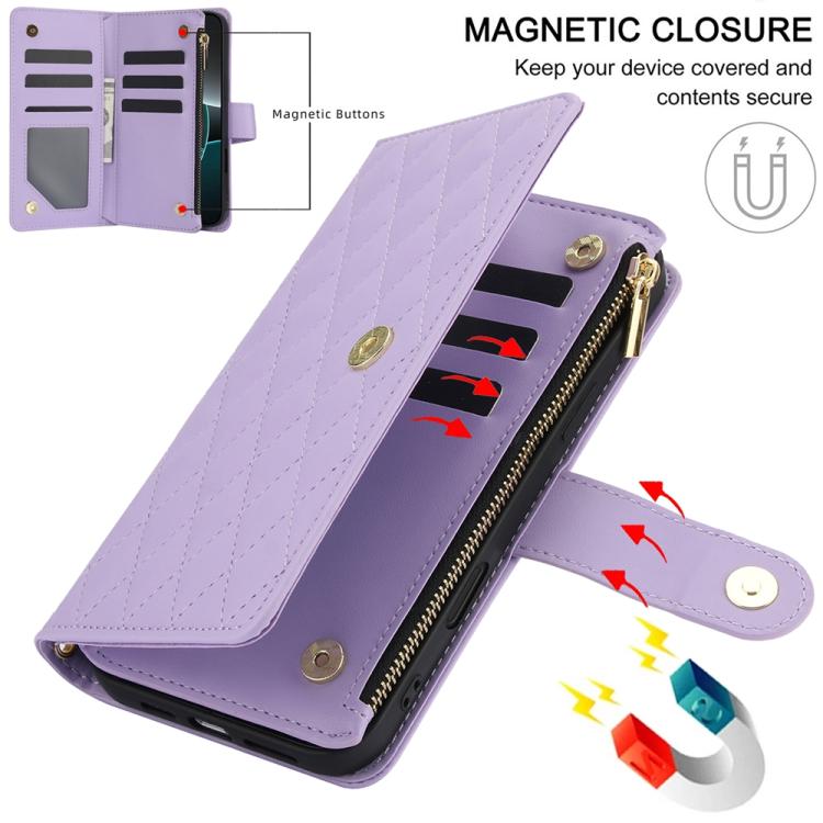 Funda de cuero con cremallera rombal para iPhone 17 Pro YM016 con tarjetero y cordón (morado claro)