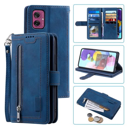Funda de Cuero con Cremallera y Cordón para Motorola Moto G55 Nine Card (Azul)