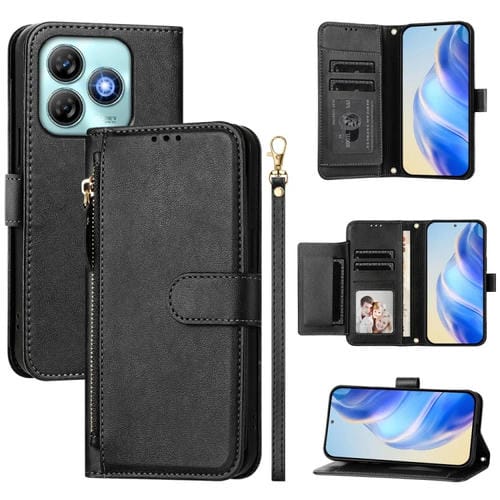 Funda de Cuero con Cremallera y Ranuras para Múltiples Tarjetas para ZTE Blade A75 4G (Negro)