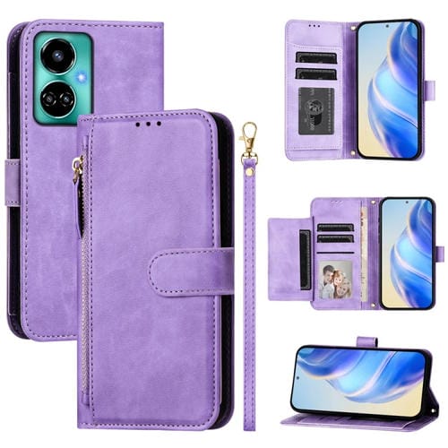 Funda de Cuero para Tecno Camon 19 y Camon 19 Pro 5G con Cremallera y Ranuras para Tarjetas (Morado)