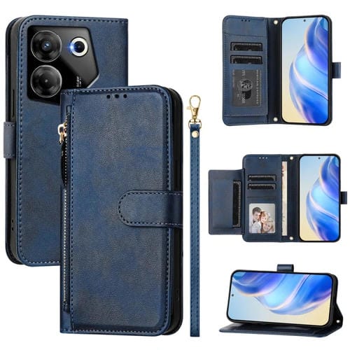 Funda de Cuero para Tecno Camon 20 Pro 5G con Cremallera y Ranuras para Tarjetas (Azul)