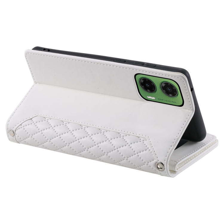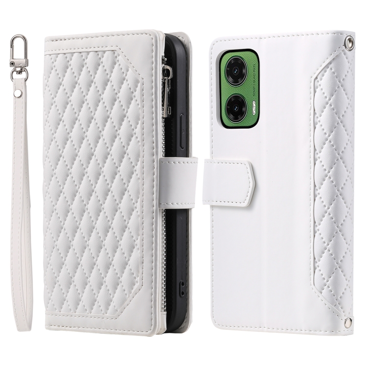 Funda de Cuero con Cremallera y Textura de Cuadrícula para Motorola Moto G35 con Cordón (Blanco)