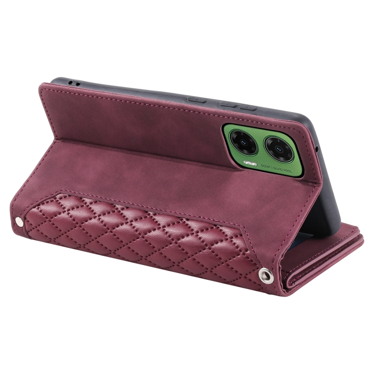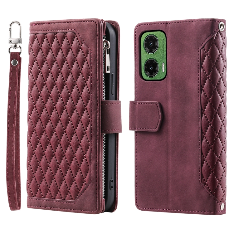 Funda de Cuero con Cremallera y Textura de Cuadrícula para Motorola Moto G35 con Cordón (Rojo Vino)