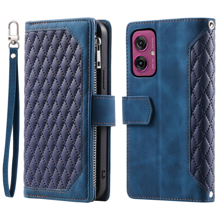 Funda de Cuero con Cremallera y Textura de Cuadrícula para Motorola Moto G55 con Cordón (Azul)