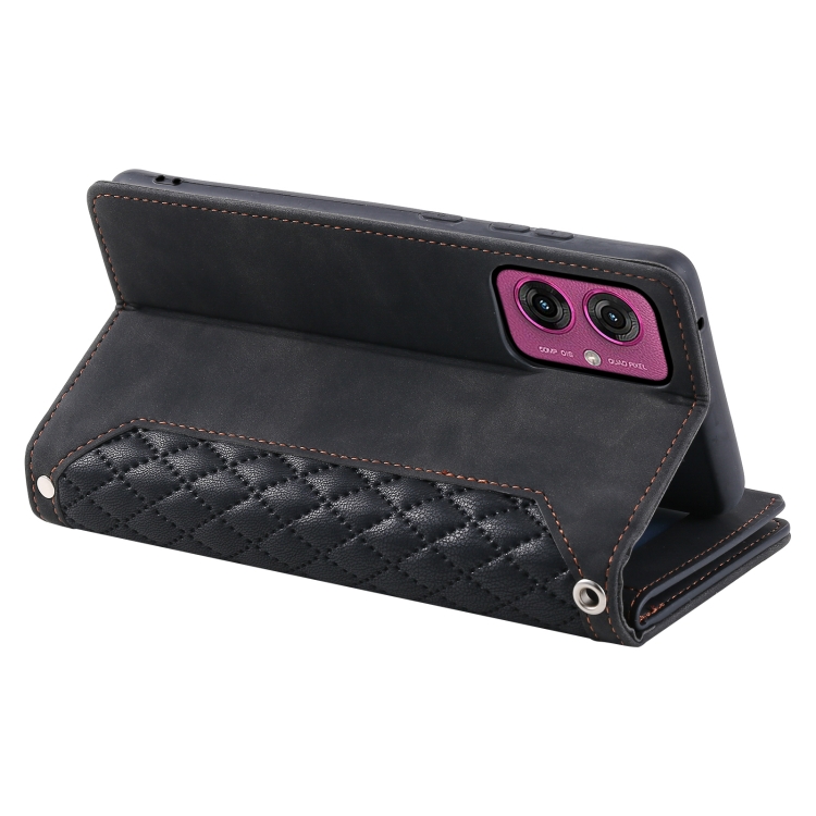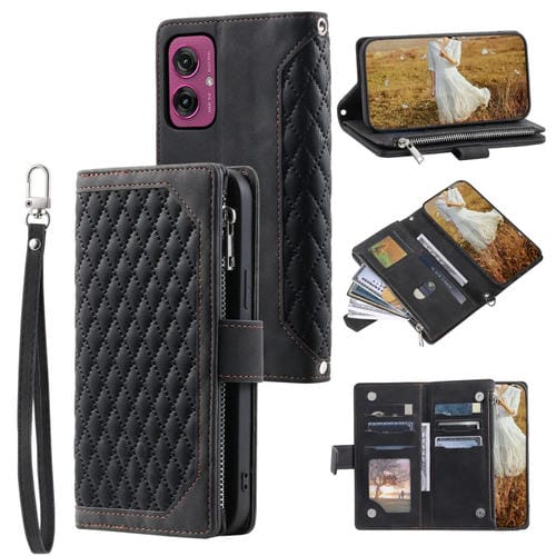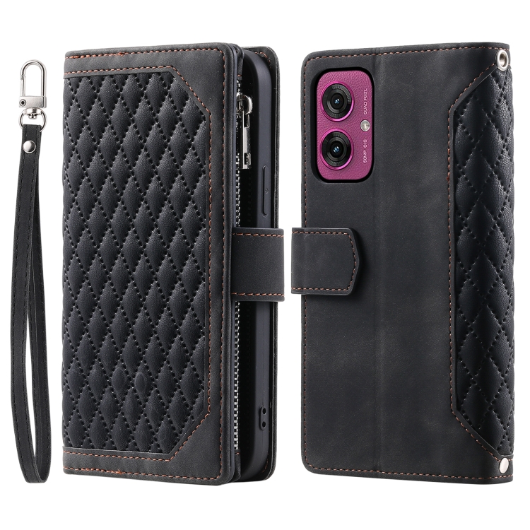 Funda de Cuero con Cremallera y Textura de Cuadrícula para Motorola Moto G55 con Cordón (Negro)