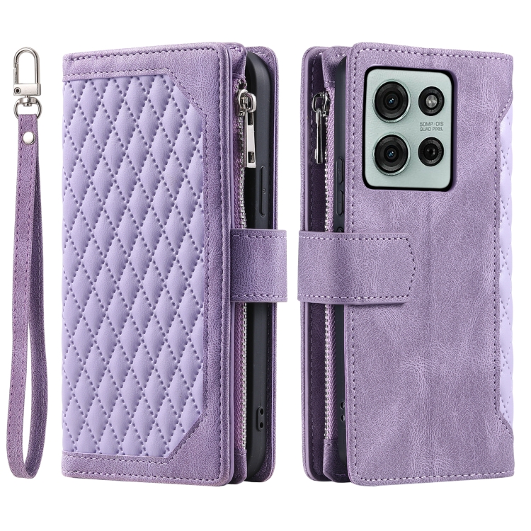 Funda de Cuero con Cremallera y Textura de Cuadrícula para Motorola Moto G75 5G con Cordón (Morado)