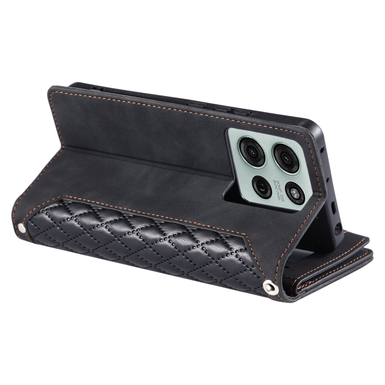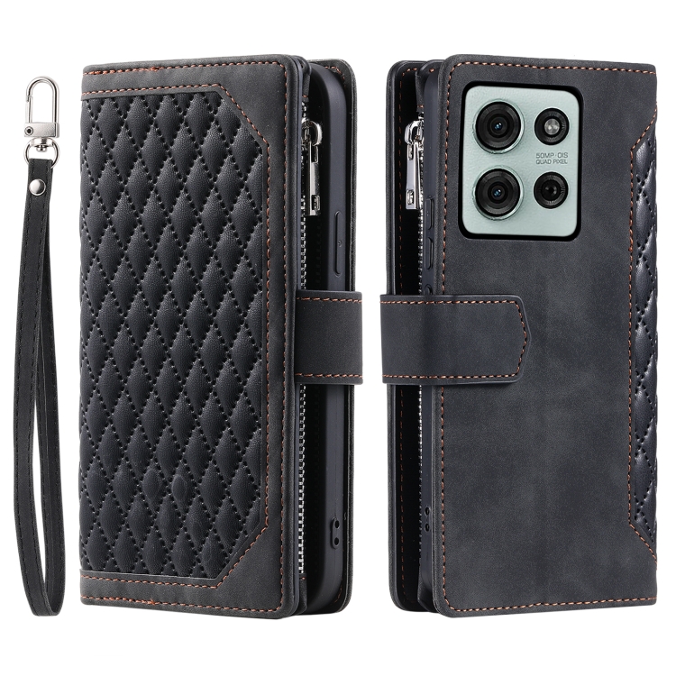 Funda de Cuero con Cremallera y Textura de Cuadrícula para Motorola Moto G75 5G con Cordón (Negro)