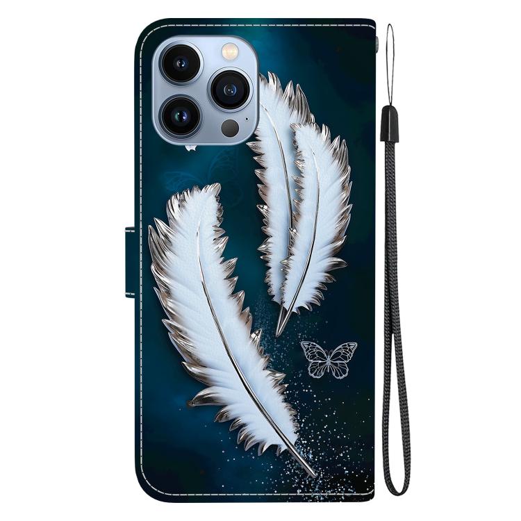 Funda de Cuero para iPhone 15 Pro con Dibujo de Colores y Textura de Cristal (Plumas de Mariposa Blancas)