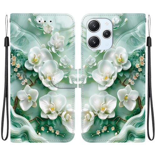 Funda de Cuero con Dibujo de Colores y Textura de Cristal para Redmi 12 4G/5G/Poco M6 Pro (Flores de Jade)
