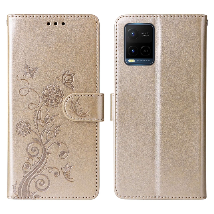 Funda de Cuero con Diseño de Mariposas En Relieve para Vivo Y21 2021 / Y21S / Y33S 4G (Dorada)