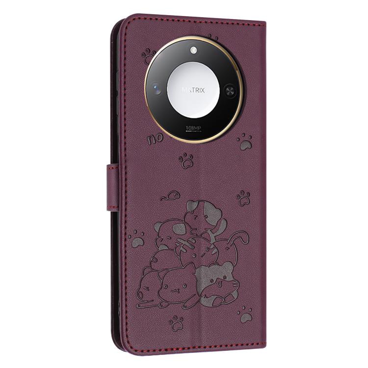 Funda de Cuero Honor X60/X9C con Diseño de Gatito en Relieve y Cordón (Rojo Vino)