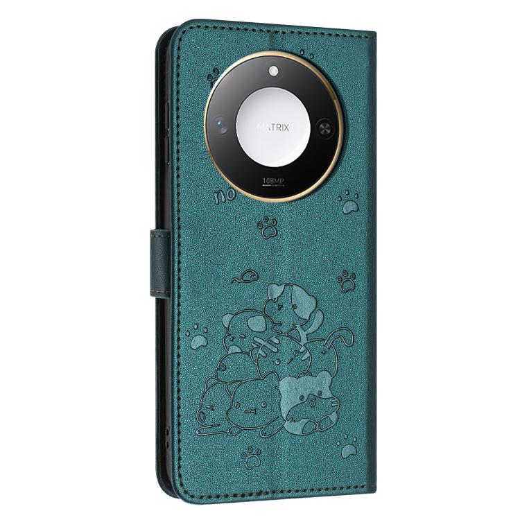 Funda de Cuero Honor X60/X9C con Diseño de Gatito en Relieve y Cordón (Verde Oscuro)