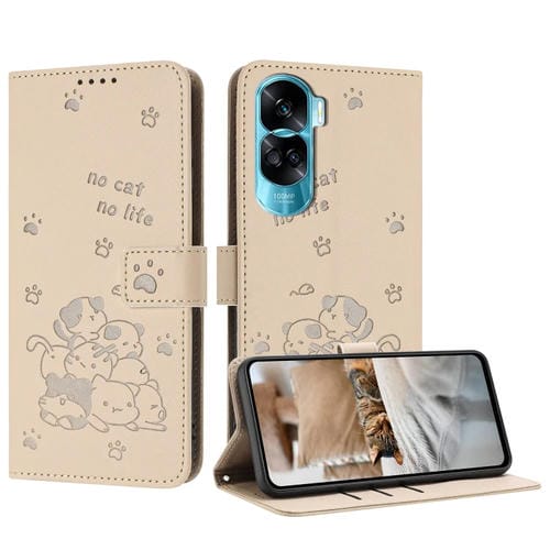 Funda de Piel para Honor 90 Lite/X50I 5G con Diseño de Gatito en Relieve y Cordón (Beige)