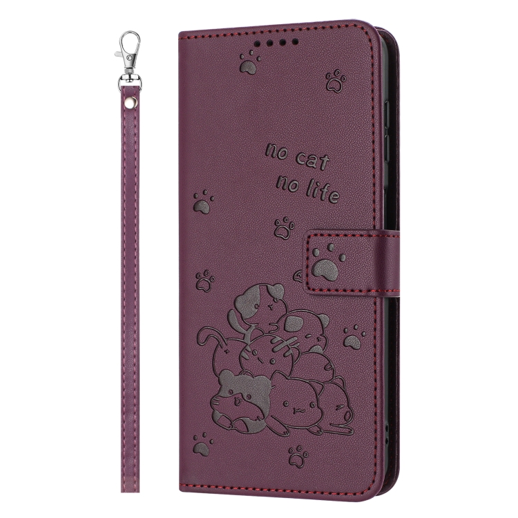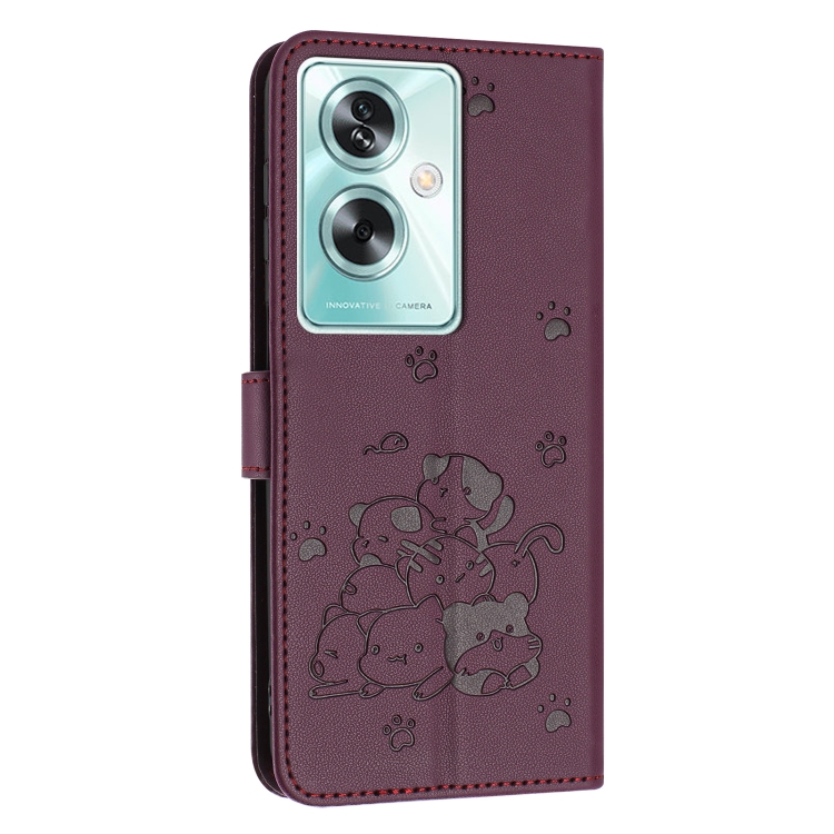 Funda de Cuero para OnePlus Nord N30 Se 5G con Diseño de Gatito en Relieve y Cordón (Rojo Vino)