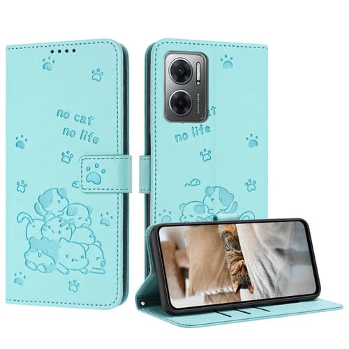 Funda de Piel con Diseño de Gatito En Relieve y Cordón para Redmi 10 5G / Note 11E 5G (Verde Menta)