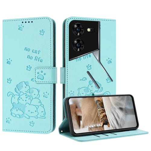 Funda de Cuero para Tecno Pova 5 Pro con Diseño de Gatito en Relieve y Cordón (Verde Menta)