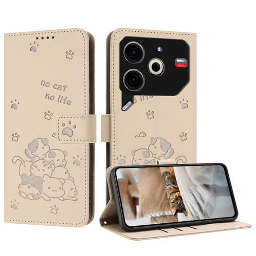 Funda de Cuero para Tecno Pova 6 Neo con Diseño de Gatito en Relieve y Cordón (Beige)