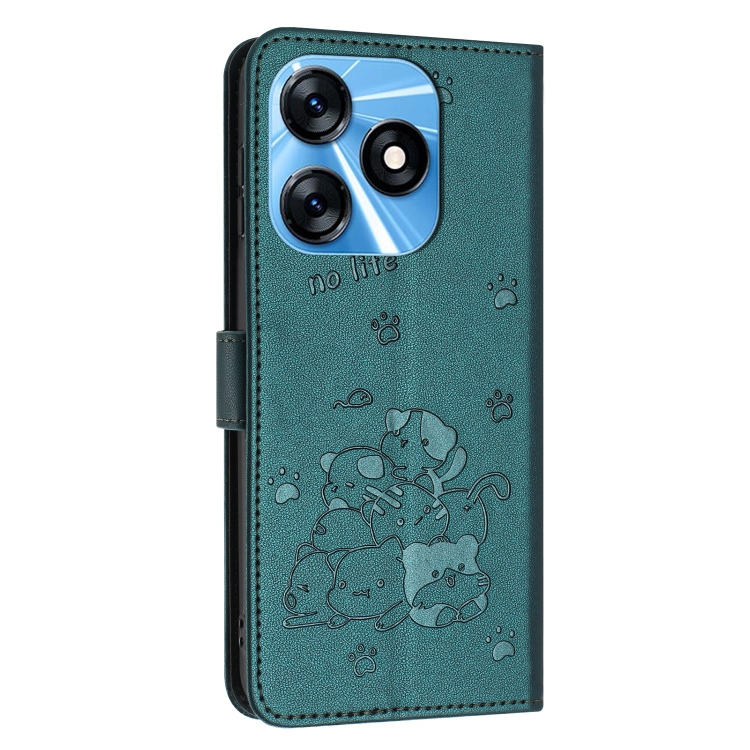 Funda de Cuero para Tecno Spark 10 4G y Spark 10C con Diseño de Gatito En Relieve y Cordón (Verde Oscuro)