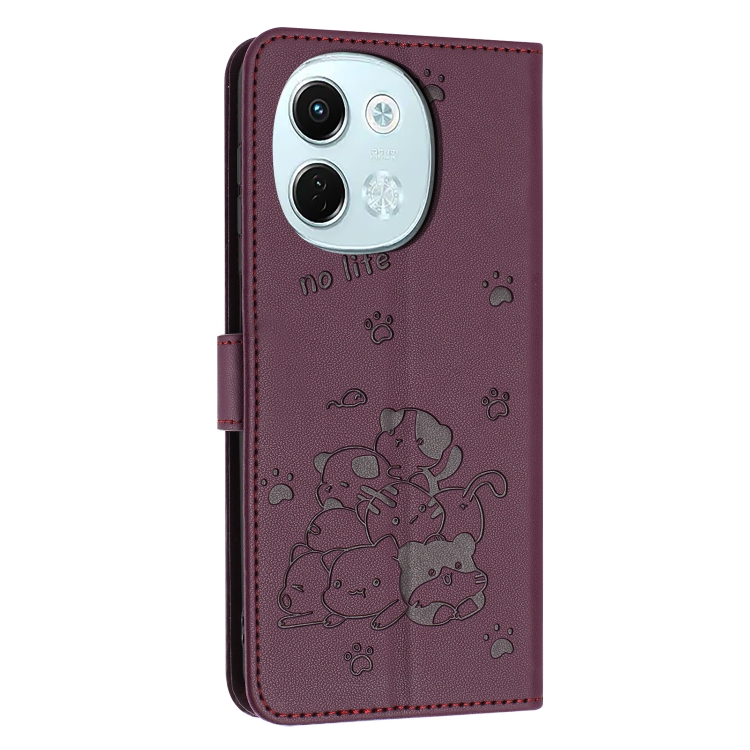 Funda de Cuero para Tecno Spark 30 5G con Diseño de Gatito En Relieve y Cordón (Rojo Vino)