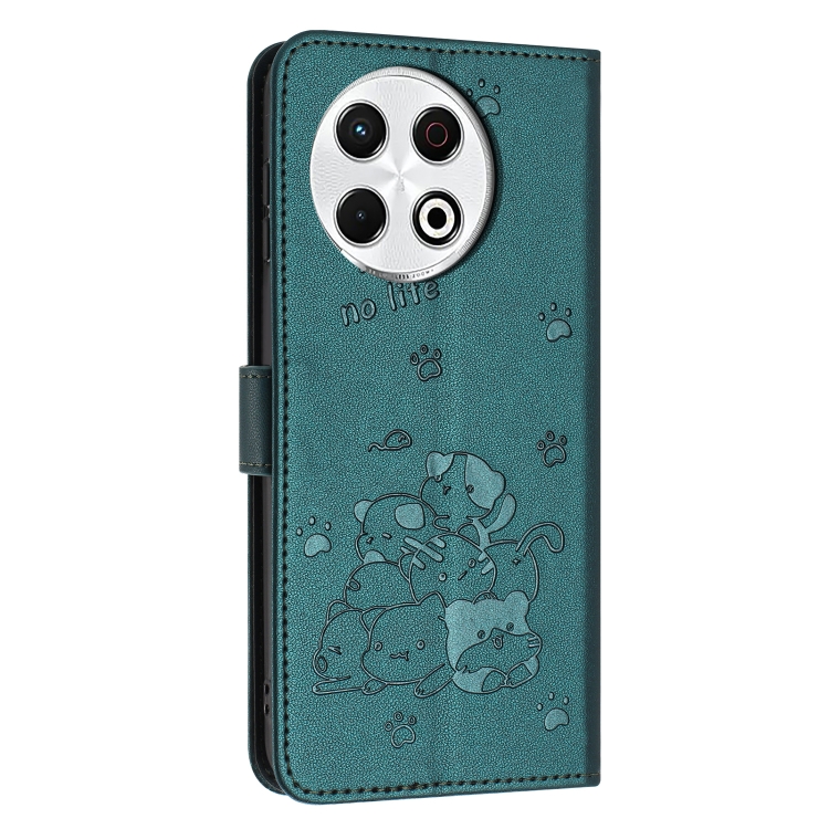 Funda de Cuero para Tecno Spark 30 Pro con Diseño de Gatito En Relieve y Cordón (Verde Oscuro)