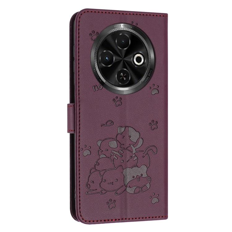 Funda de Cuero para Tecno Spark 30C con Diseño de Gatito En Relieve y Cordón (Rojo Vino)