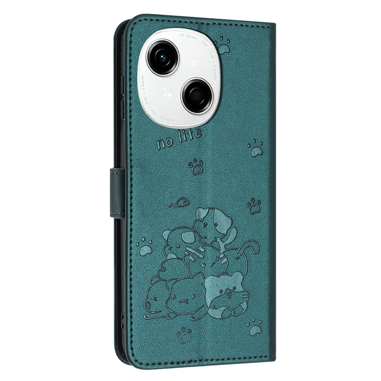 Funda de Cuero para Tecno Spark Go 1 Go 2025 con Diseño de Gatito en Relieve y Cordón (Verde Oscuro)