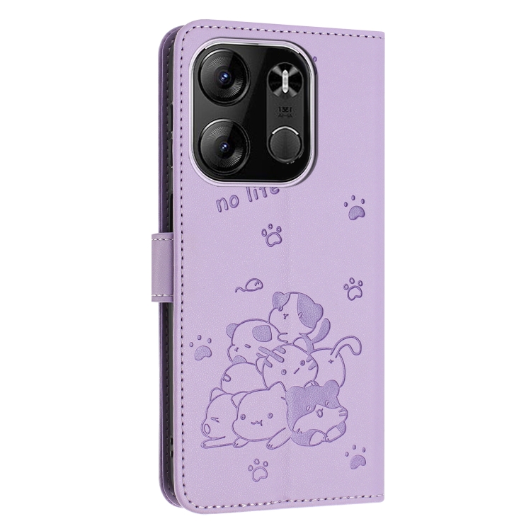Funda de Cuero para Tecno Spark Go 2023 con Diseño de Gatito en Relieve y Cordón (Morado)