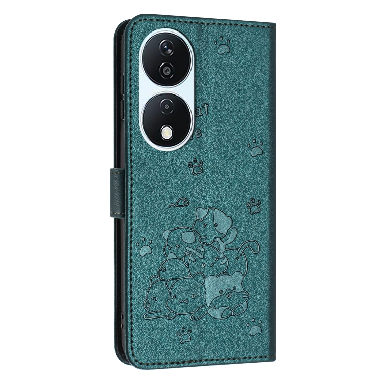 Funda de Piel con Diseño de Gatito en Relieve para Honor X7B 4G/5G con Cordón (Verde Oscuro)