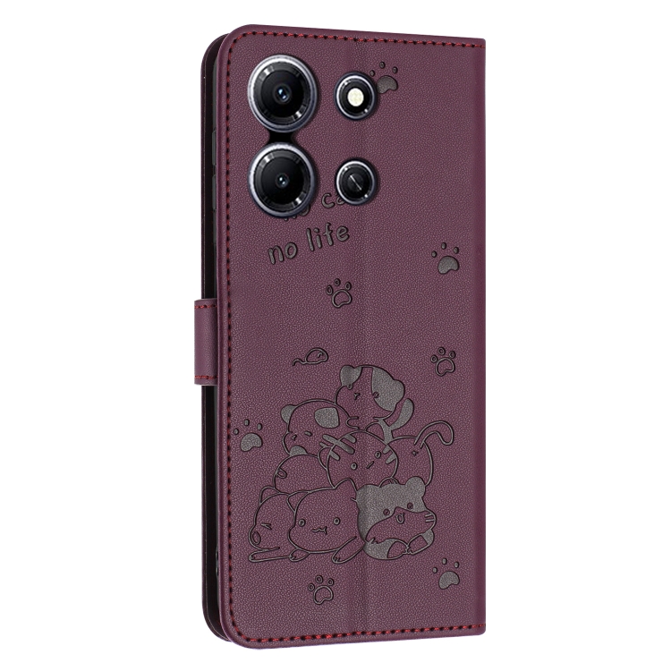 Funda de Cuero Infinix Note 30I con Diseño de Gatito en Relieve y Cordón (Rojo Vino)